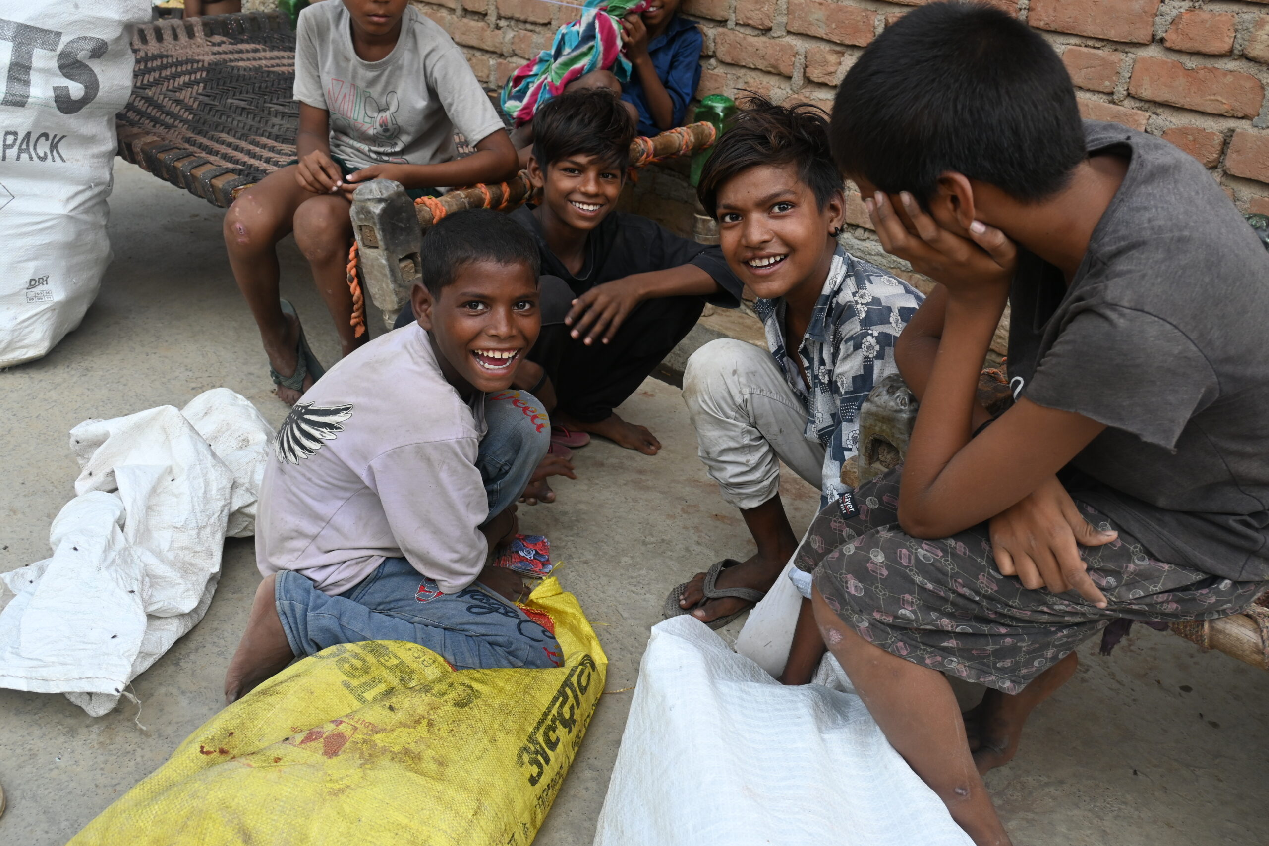 A candid scene of children gathered around colorful sacks in a modest outdoor setting, sharing laughter and conversation. Woven cots and a brick wall frame the moment. Ideal for editorial use, NGO campaigns, or storytelling projects focused on rural life, community bonding, and the spirit of childhood.