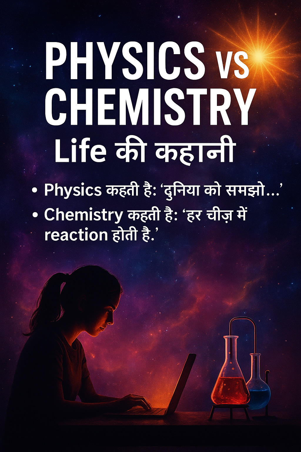 A thought-provoking visual blending cosmic wonder with laboratory precision. Featuring Hindi-English text on physics and chemistry’s take on life, this image is ideal for educational, editorial, or conceptual collections exploring science, philosophy, and bilingual storytelling.