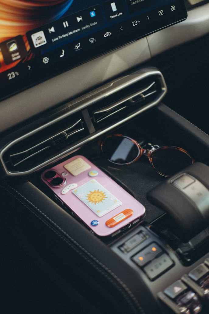 A modern car console with a stickered smartphone and round sunglasses, framed by sleek digital displays. Ideal for use in lifestyle blogs, automotive ads, tech reviews, or editorial features highlighting personal style and in-car accessories.